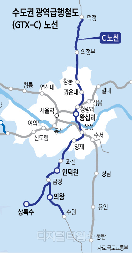 C노선은 양주시 덕정역부터 수원역까지 14개 정거장을 연결하는 총 연장 86.46㎞ 구간이다. 왕십리역과 의왕역 등 4개 추가역을 포함해 공사비만 4조6084억원에 달한다. 민자사업자가 건설하고 40년간 운영하는 수익형 민간투자사업으로 진행된다.