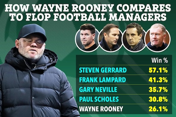 루니 감독은 잉글랜드 프리미어리그 맨유에서 559경기 253골 145도움을 기록했다. 잉글랜드 국가대표 유니폼을 입고 12경기 53골 21도움을 터트렸다. 그는 잉글랜드 대표팀 최다 출전 2위에 이름을 올리고 있다. 선수로서는 최고였지만 감독으로서는 최악의 모습을 보여주며 야인이 됐다.