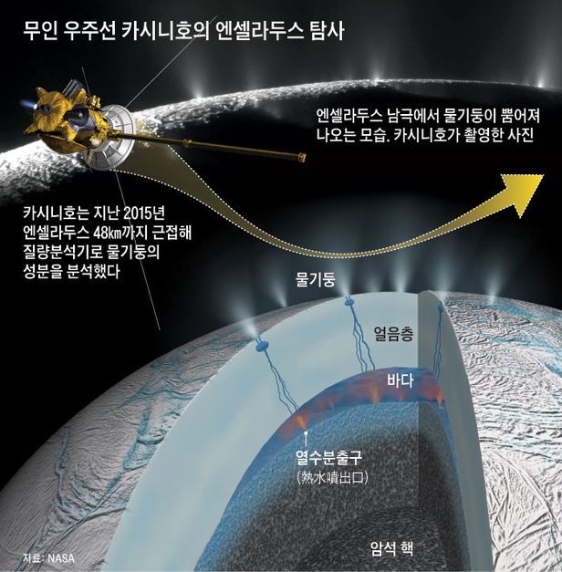 엔켈라두스는 지름이 504㎞로 지구의 4% 크기에 불과하다. 달과 비교해도 7분의 1에 그친다. 과학자들이 이 작은 위성에 주목하는 것은 목성의 위성인 유로파와 함께 태양계에서 물이 있을 가능성이 가장 큰 천체로 꼽히기 때문이다. 특히 다른 곳처럼 물을 살짝 얼린 슬러시나 얼음 상태가 아니라 생명체가 탄생하기에 충분한 온도의 바다가 있을 것으로 추정된다.